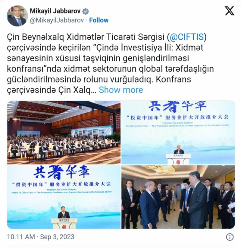 “Çin Beynəlxalq Xidmətlər Ticarəti Sərgisi çərçivəsində keçirilən “Çində İnvestisiya İli: Xidmət sənayesinin xüsusi təşviqinin genişləndirilməsi konfransı”nda xidmət sektorunun qlobal tərəfdaşlığın gücləndirilməsində rolunu vurğuladıq”.
