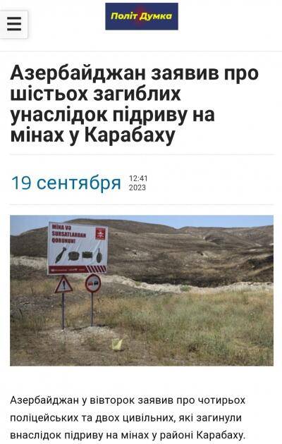 Ukraynanın nüfuzlu kütləvi informasiya vasitələri Azərbaycan ərazilərində ermənilərin mina terrorunun davam etməsi nəticəsində son günlər azərbaycanlı polislərin və mülki şəxslərin həlak olması barədə materiallar dərc edib.